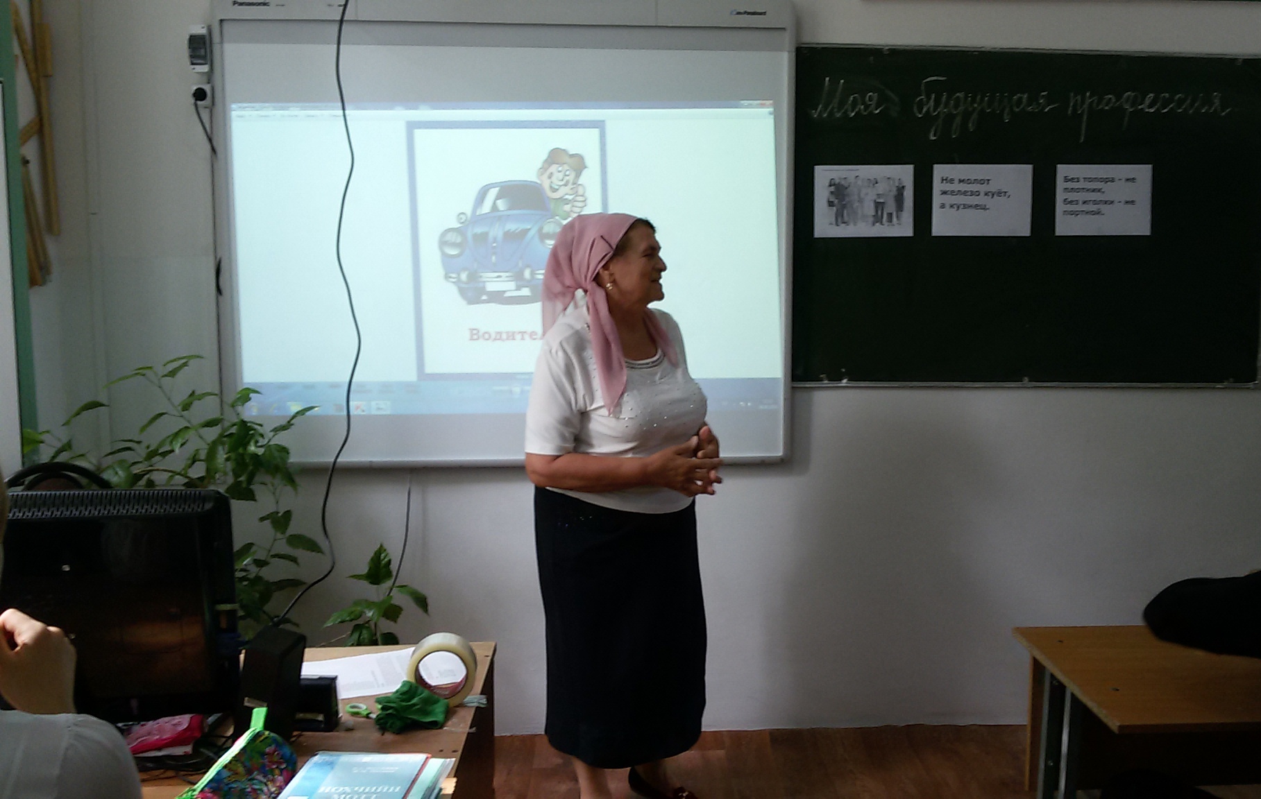 Ребятам была представлена презентация о профессиях, также информацию о своих профессиях подготовили учителя, школьная медсестра, повар школы. Заслуженный учитель ЧР Халидова С.З. рассказала о каждодневной ответственности и трудностях своей профессии, раскрыла значение и важность своей профессии. Медсестра и повар школы поделились с особенностями своих профессий.