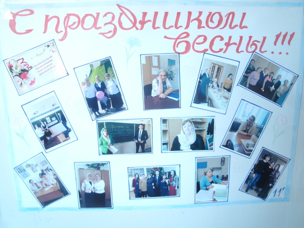 08.03.2015Поздравляю всех учителей, всех, кто работает на территории школы, работает достойно, с полной самоотдачей. Учителя, своим отношением к работе, своим трудом, улыбками, добротой и вниманием к детям, делают так, что наша школа становится лучше. Я с большим удовольствием поздравляю Вас с 8 марта и хочу пожелать, чтобы всегда Вас радовали ваши ученики. Директор школы Патаева Яхита Султановна.