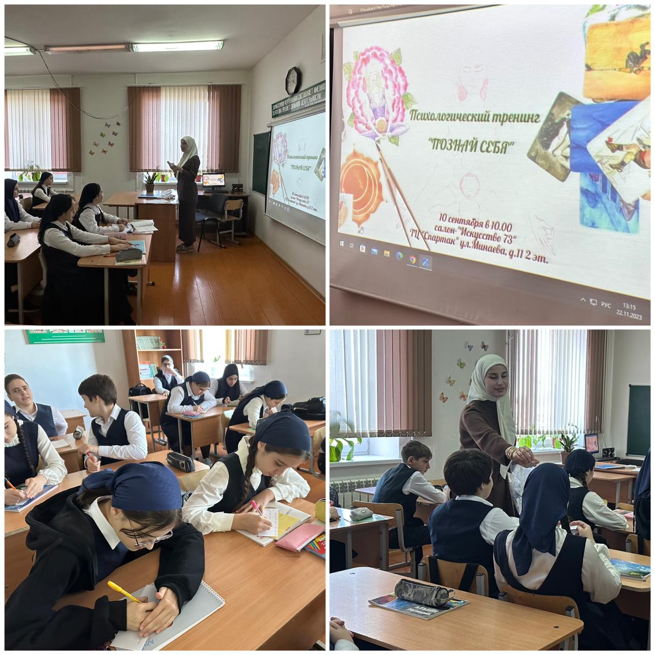 23.11.202323.11.2023 в рамках «Недели психологии» педагогом-психологом Зангаевой А.Х. был проведен тренинг «Познай себя сам» с обучающимися 7 классов. Цель: знакомство, снятие напряженности, повышение сплоченности группы.